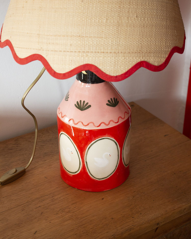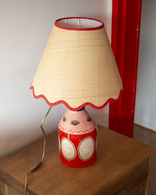 Ce pied de lampe est une pièce unique, modelé et peint à la main avec des engobes colorées. Il est vendu sans l'abat-jour (la douille et l'interrupteur sont inclus et prévus pour un abat jour standard d'environ 30cm de diamètre. La douille et la réhausse sont en laiton. Dimensions: 25 cm de hauteur sans compter la réhausse, 13cm de largeur.
